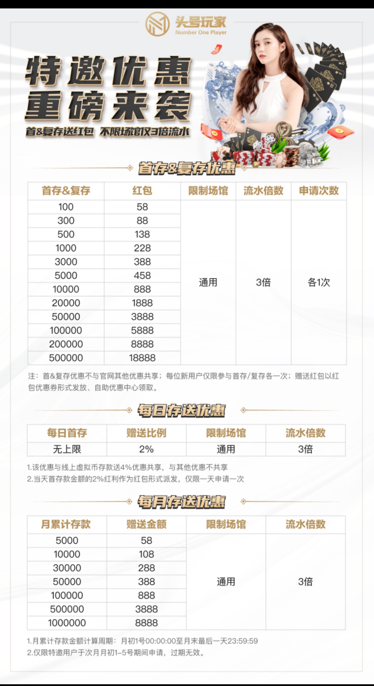 ✨首存活动:首存100送58|300送88|500送138|1000送288|3000送388,本活动本1水彩金3水,具体看下图。