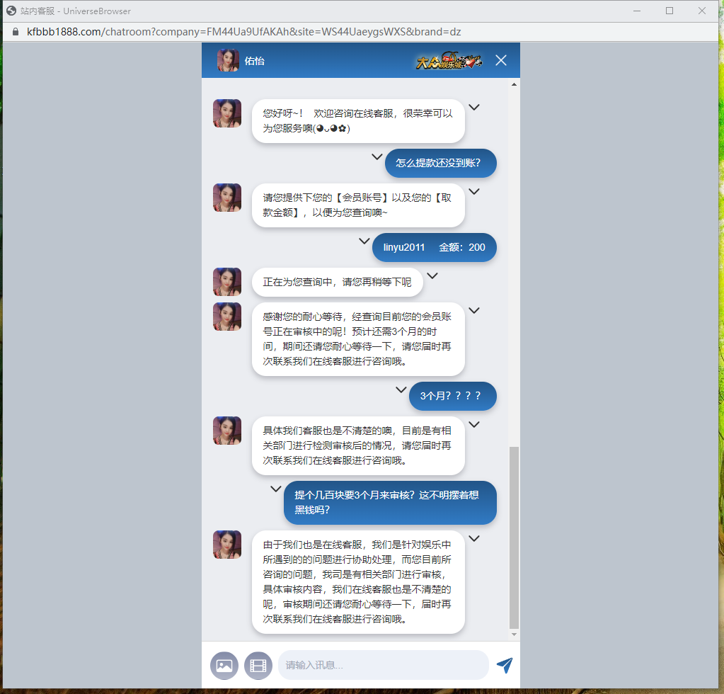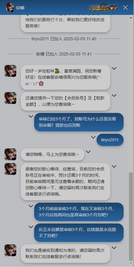 大众娱乐城,赢了不让提款,说审核3个月,3个月后联系又说审核3个月。