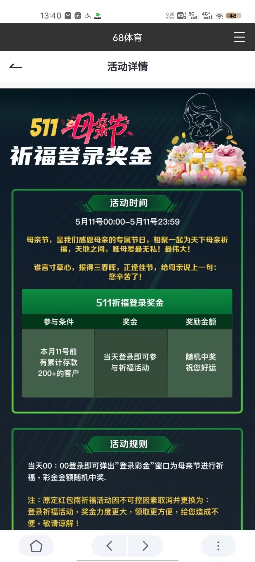 【68体育】母亲节登录彩金