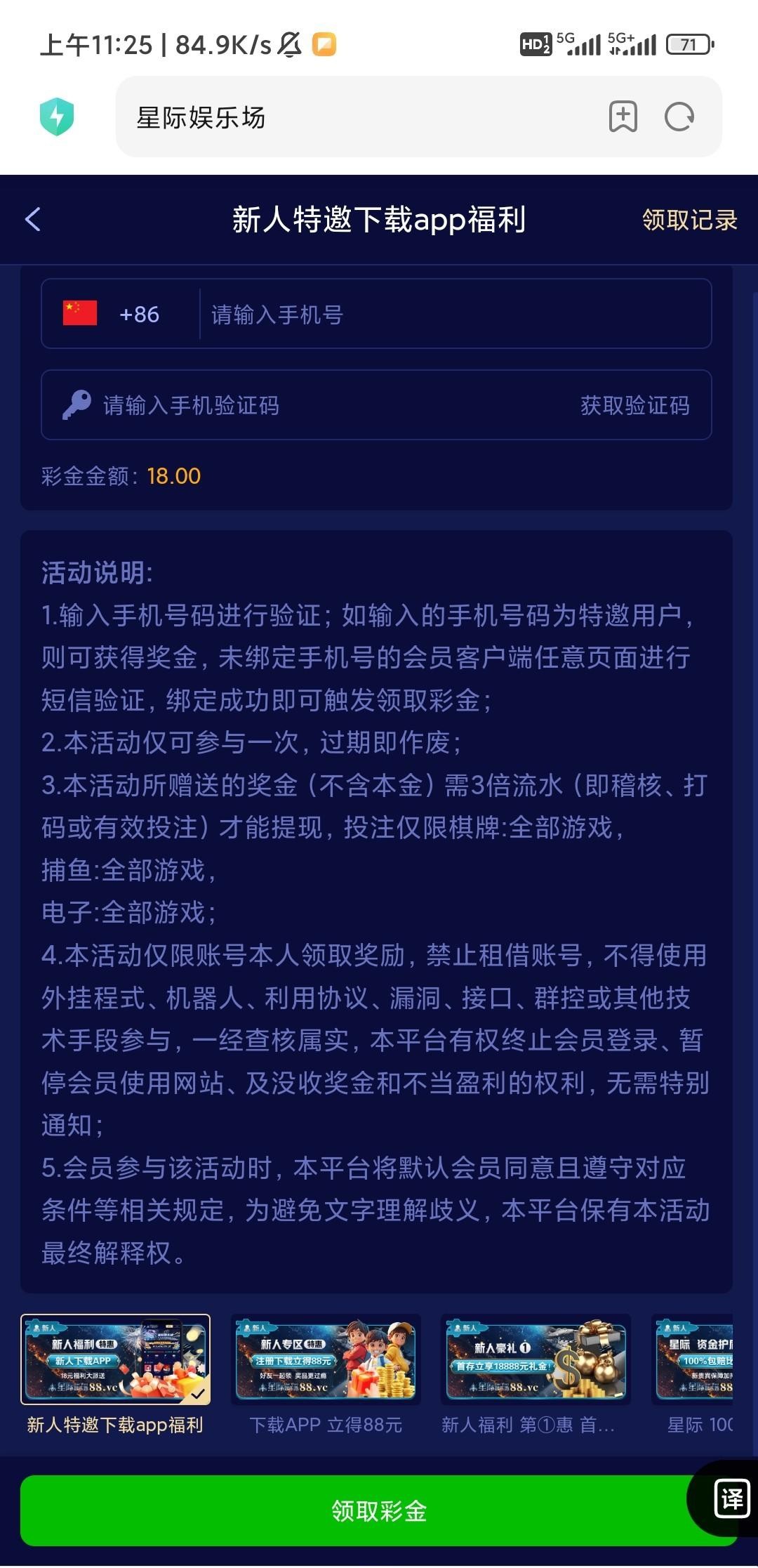 短信特邀领取彩金,我领到了没打出来,是特邀手机号注册绑定手机号自动到账18,可以先注册账号新人优惠里面测试