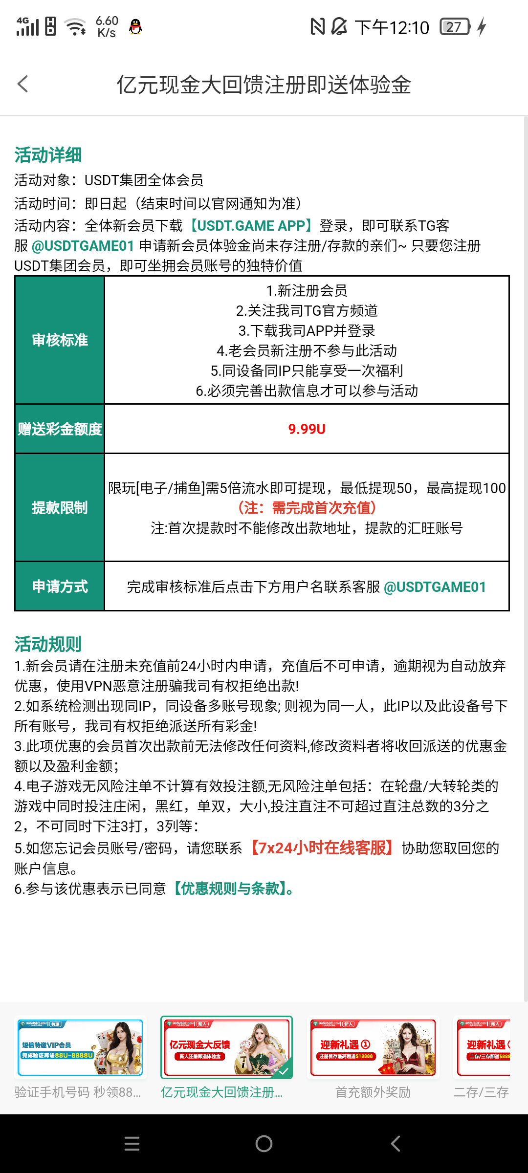 新用户注册下载APP,绑定常用的USDT,狗庄会看你流水决定给不给你送,然后联系活动上面的TG专员/客服申请9.9U≈约70RMB,出款自测!