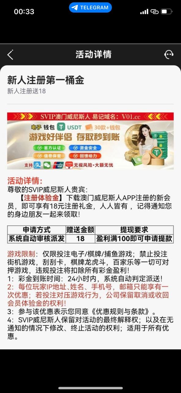 活动:下载注册澳门威尼斯人即可享有18元注册礼金系统自动派发 盈利满100可提款