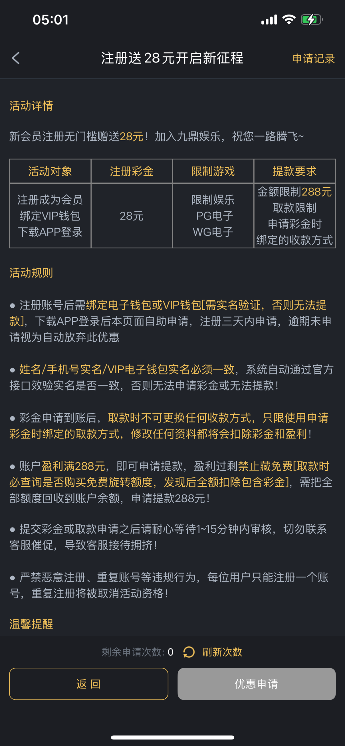 注册好绑定电子钱包然后去优惠申请 必须要下载app 我的差不多半个小时就到了 我没打出来出款自测 官网链接 0876.com