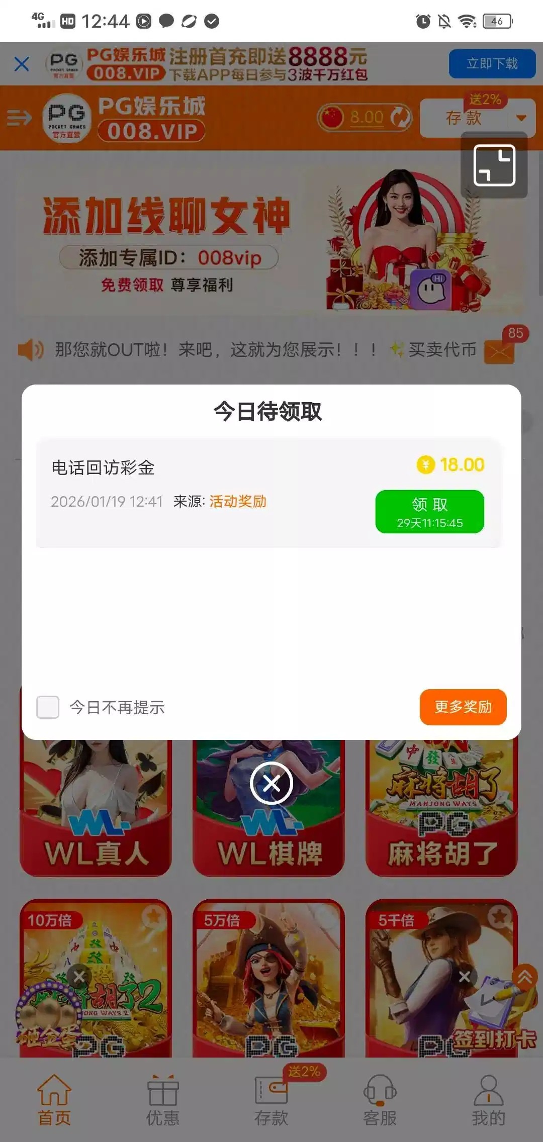 不知道啥时候注册的登录账号里有8,回访彩金18